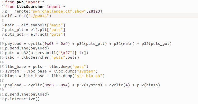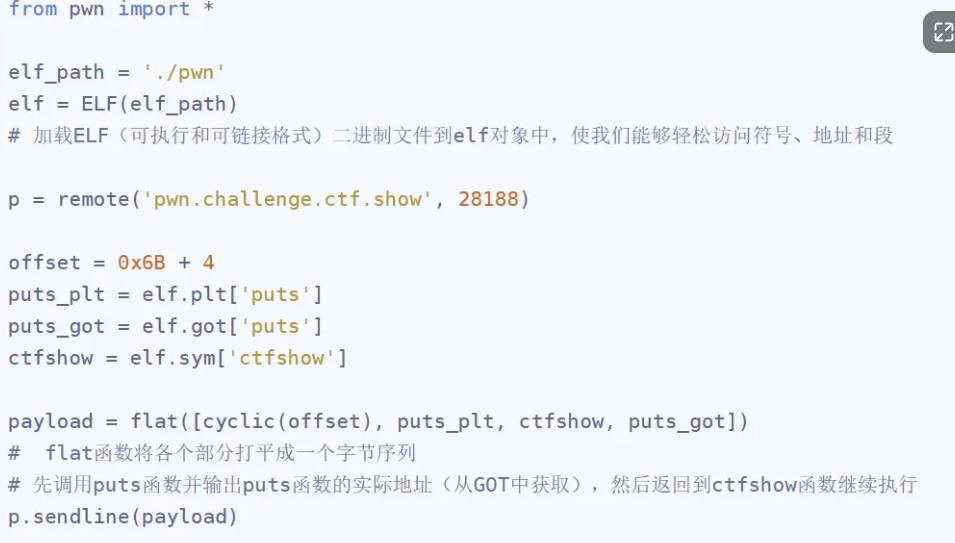 这边还是像之前一样先利用elf得到puts的.plt和.got表位置,然后构造第一个payload来先将puts的got表地址作为puts参数输出,接下来返回main函数准备接受payload2