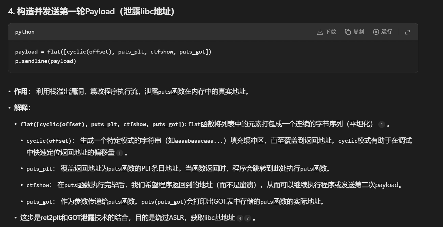 做完这些,我们也就构造好了第一个payload如下,这一步主要是利用栈溢出漏洞,泄露puts函数在内存的真实地址,绕过ASLR,获取libc的基地址(只能是puts,因为只使用过puts)