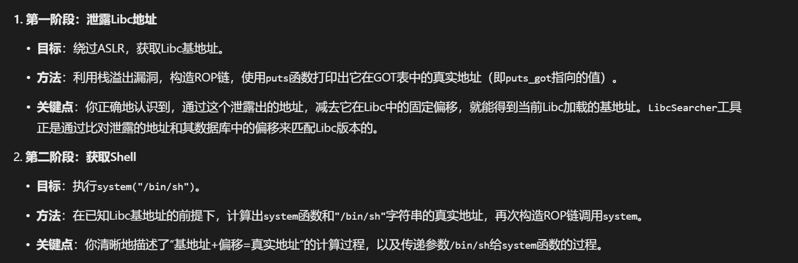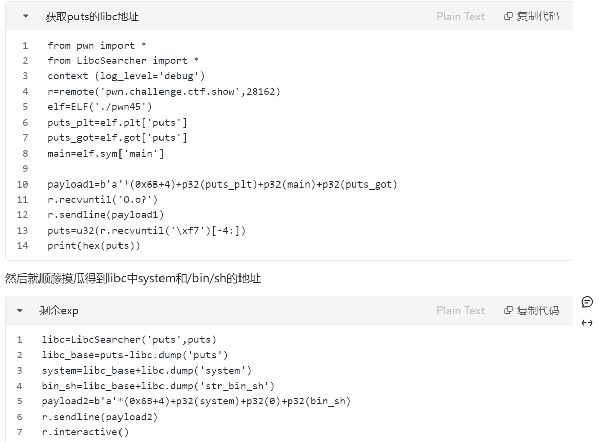 在第一个payload利用puts_plt来调用puts函数(由于已使用过puts函数)后,返回到main函数处方便第二次攻击,并且将puts_got的值作为puts参数输出出去