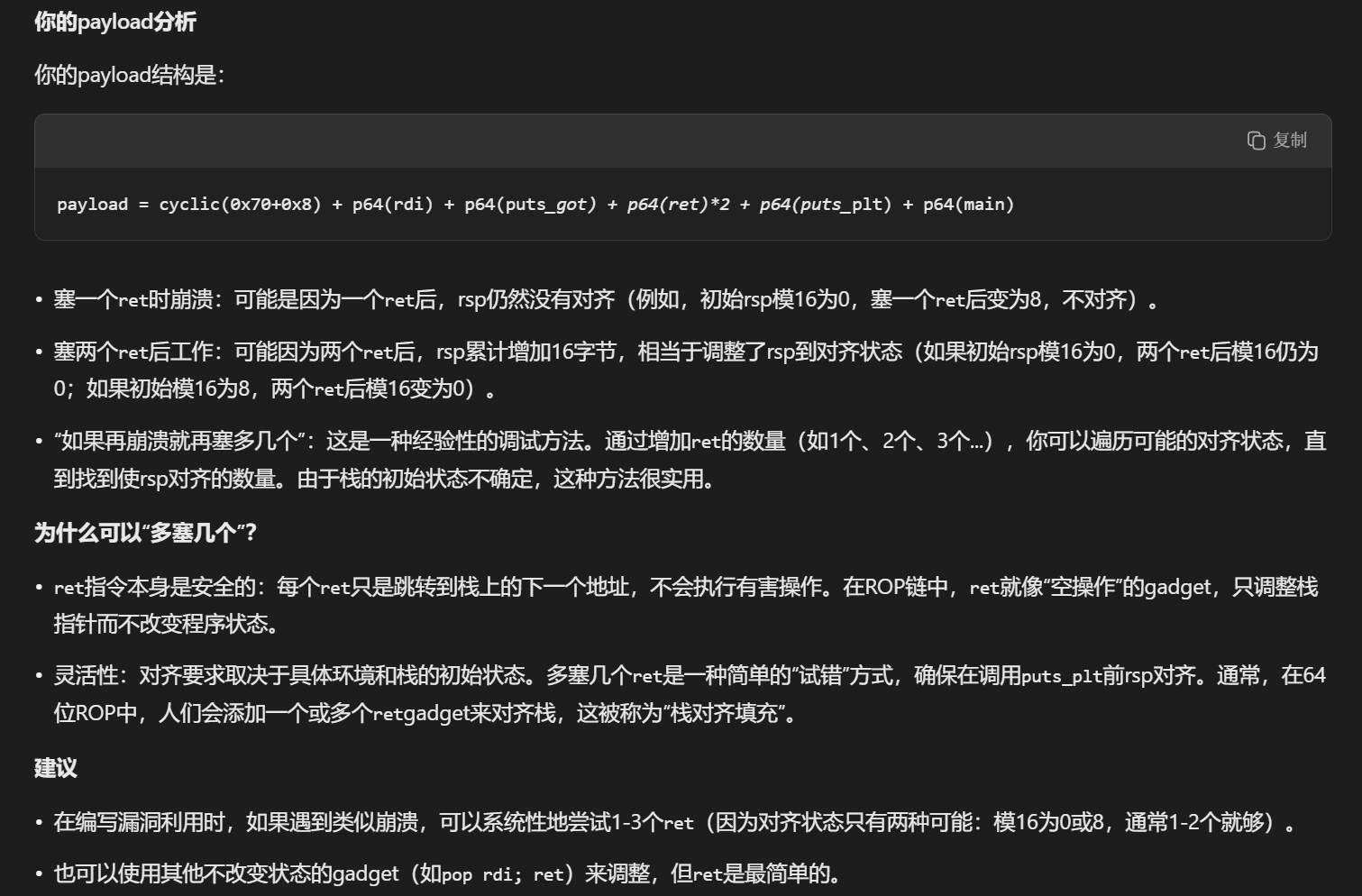 这边需要注意的一个是在构造第一个payload的时候,只写一个ret程序会崩溃,因此我们这边得乘个2,其实也就是说只塞一个ret的时候rsp没能栈对齐,所以我们需要在塞一个