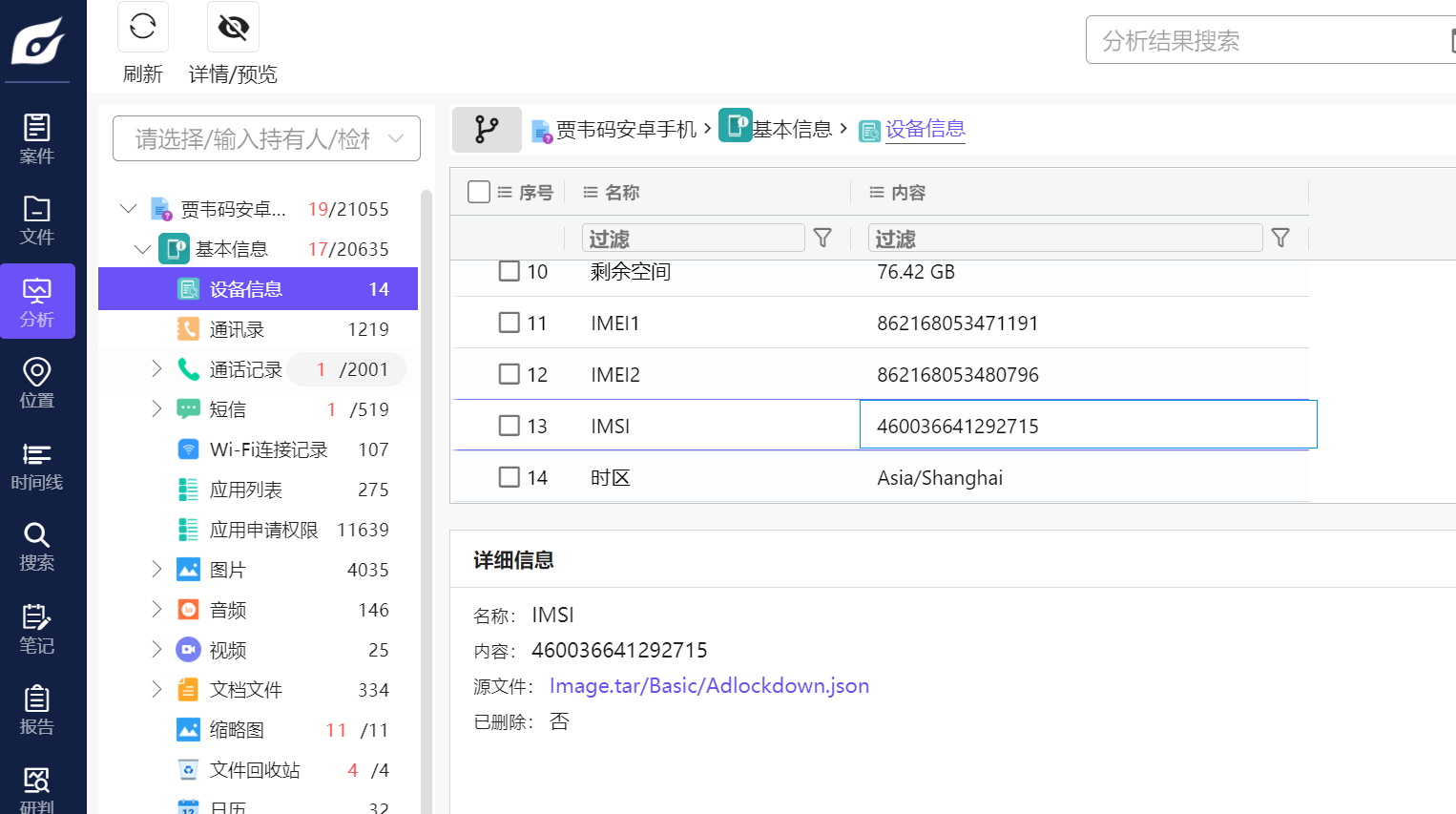 如图,直接在火眼分析安卓手机后即可在基本设备信息处找到手机的IMSI码,为460036641292715