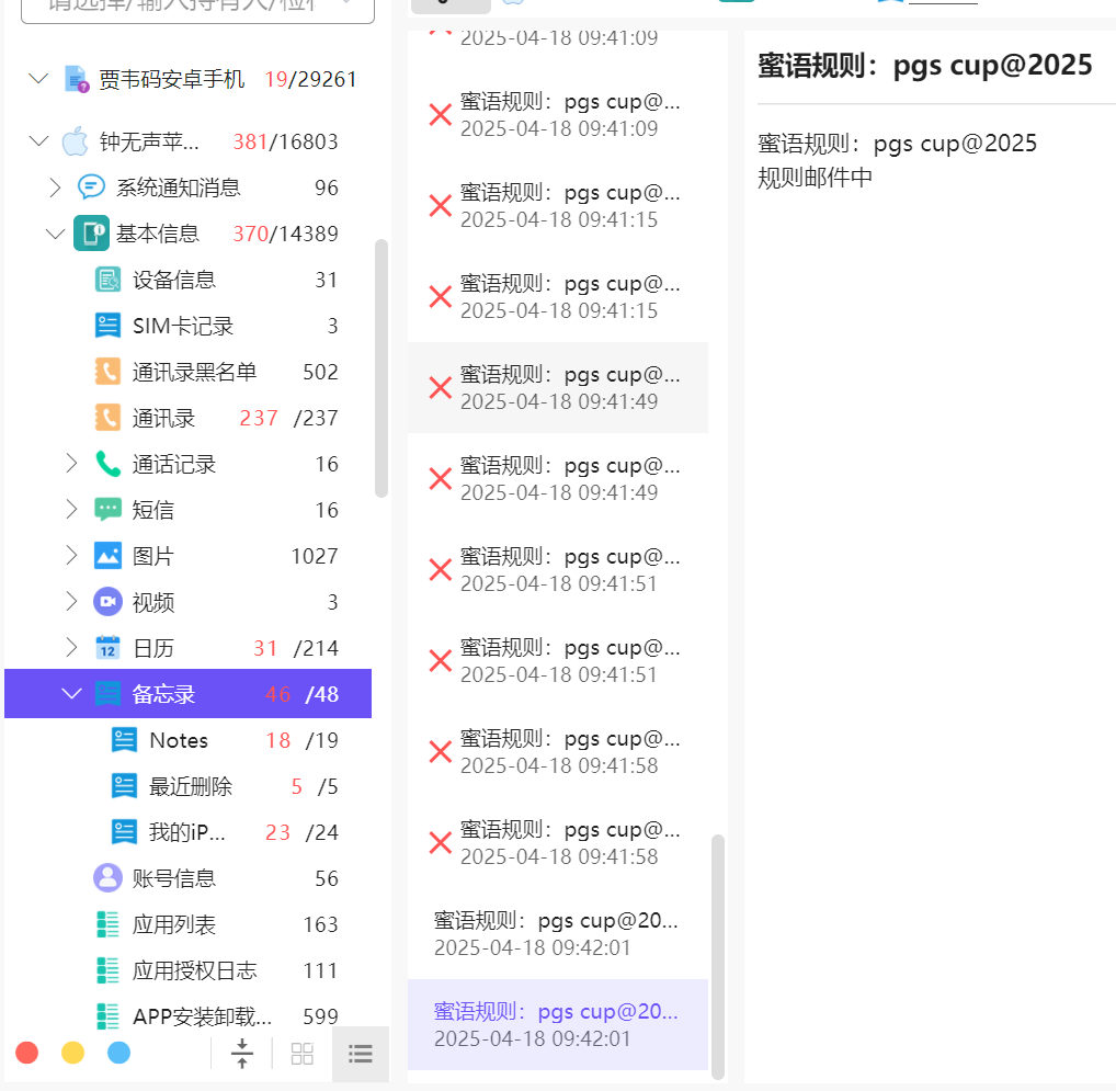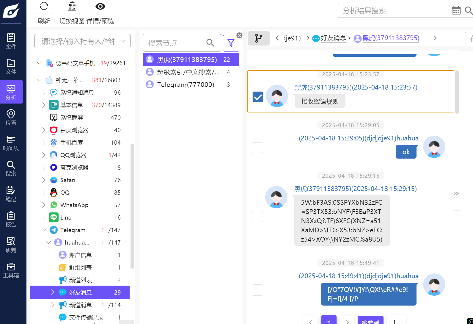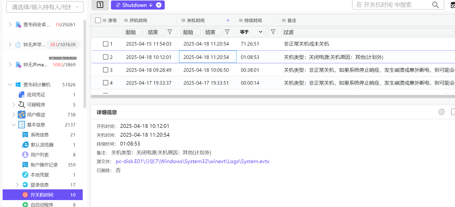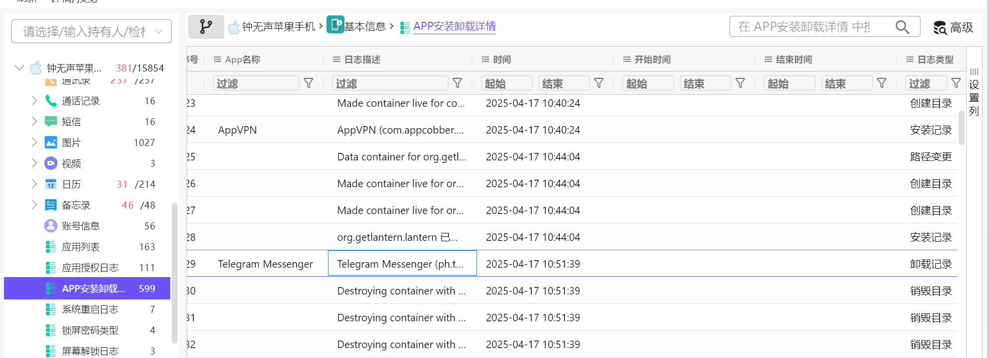 直接可以看见app的安装卸载记录,搜索telegram,易得时间为2025-04-17-10:51:39