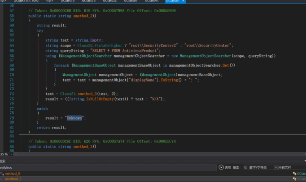 通过查找谁调用System.Management库寻找可疑的函数,该函数smethod_2()方法进行杀毒软件的查询,分析代码可知异常则返回Unknown