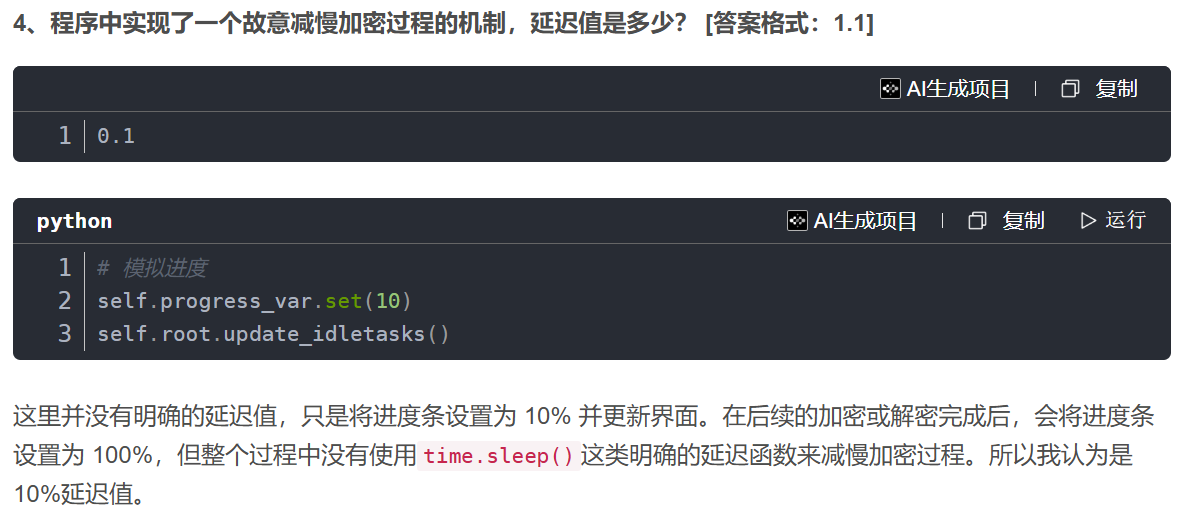 4、程序中实现了一个故意减慢加密过程的机制,延迟值是多少?【标准格式:1.1】 (5分)