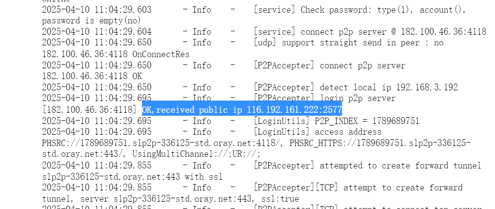 跟上题在同一个位置,可以看到这边写着成功接收到公网,后边跟着的就是ip和端口了