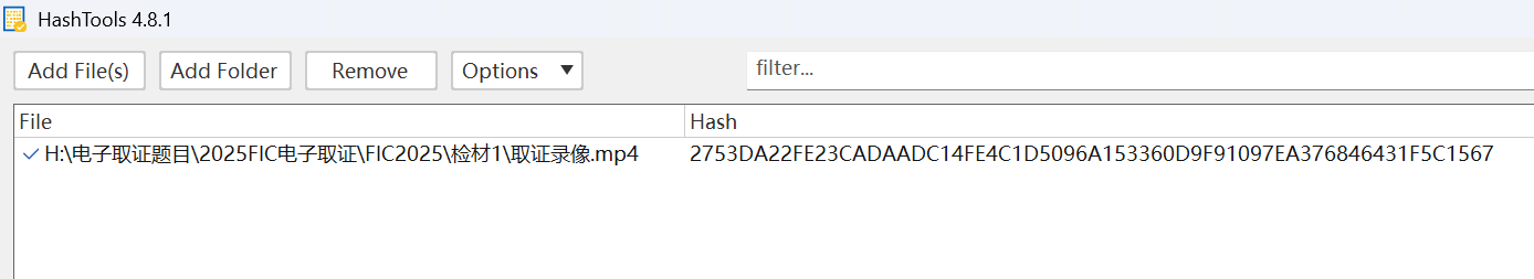1. 请分析检材一,该取证录像文件的 SHA256 值为
