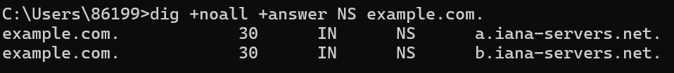 利用dig +noall +answer NS example.com.指令还是可以看到DNS有俩
