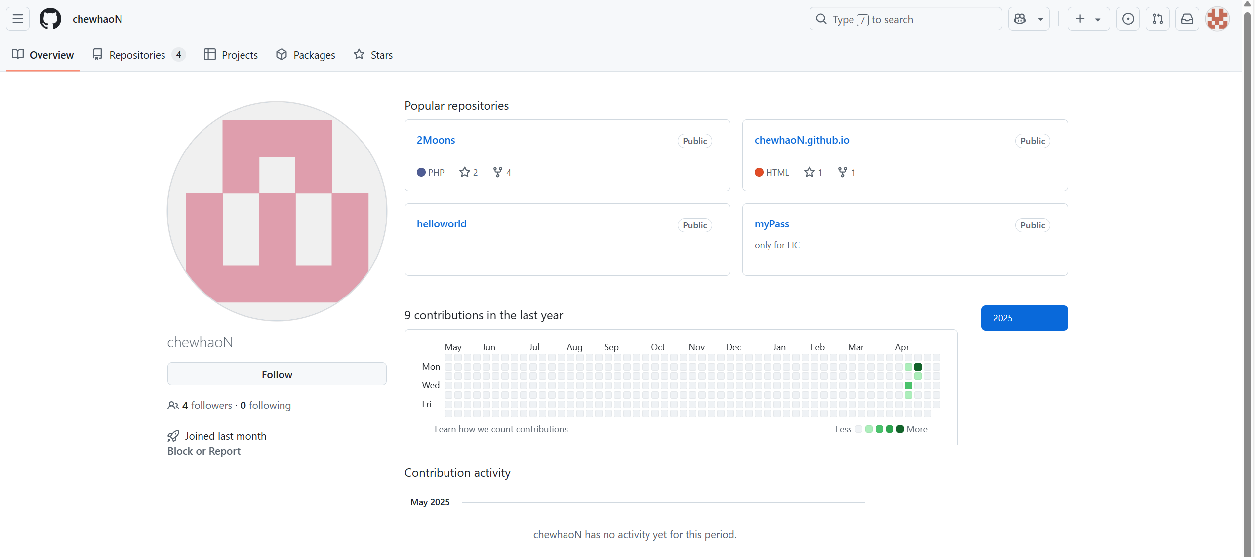 因此直接输入网址https://github.com/chewhaon便可以看见其个人页面
