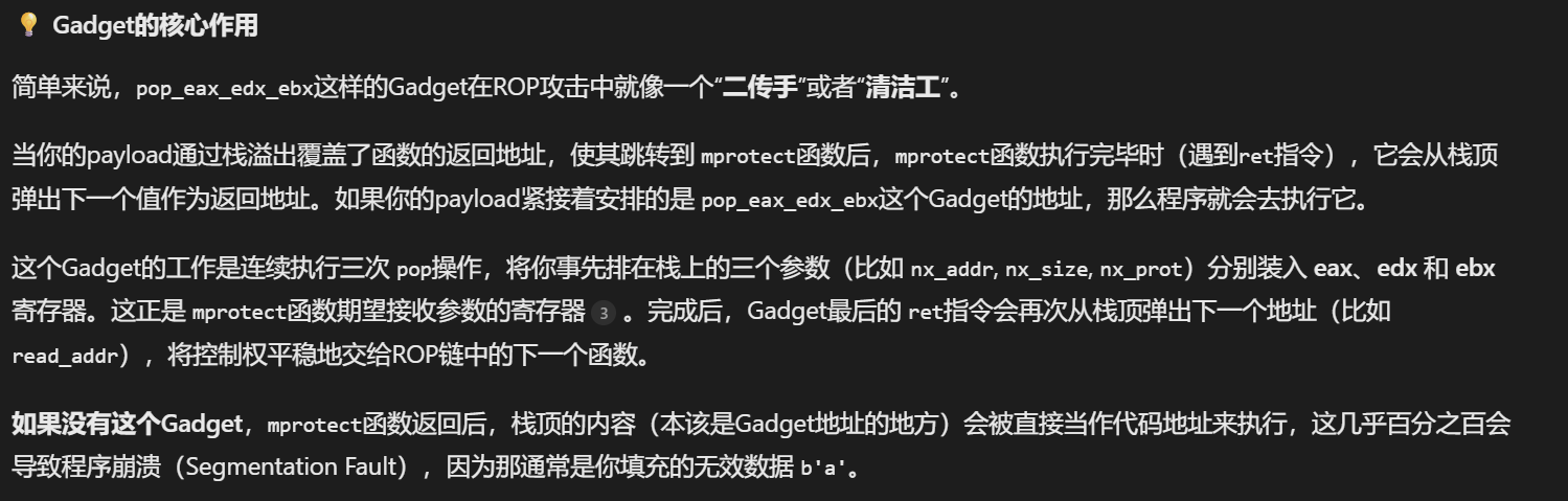 首先栈溢出、然后跳到mprotect的位置,接下来返回pop三个寄存器,然后把三个参数填入,成功修改0x80DA000地址的保护属性,可以写了