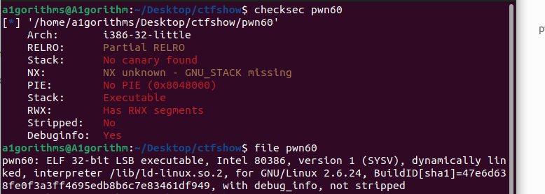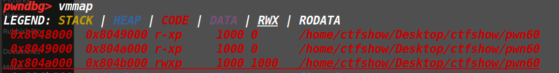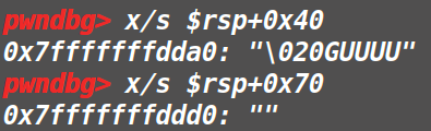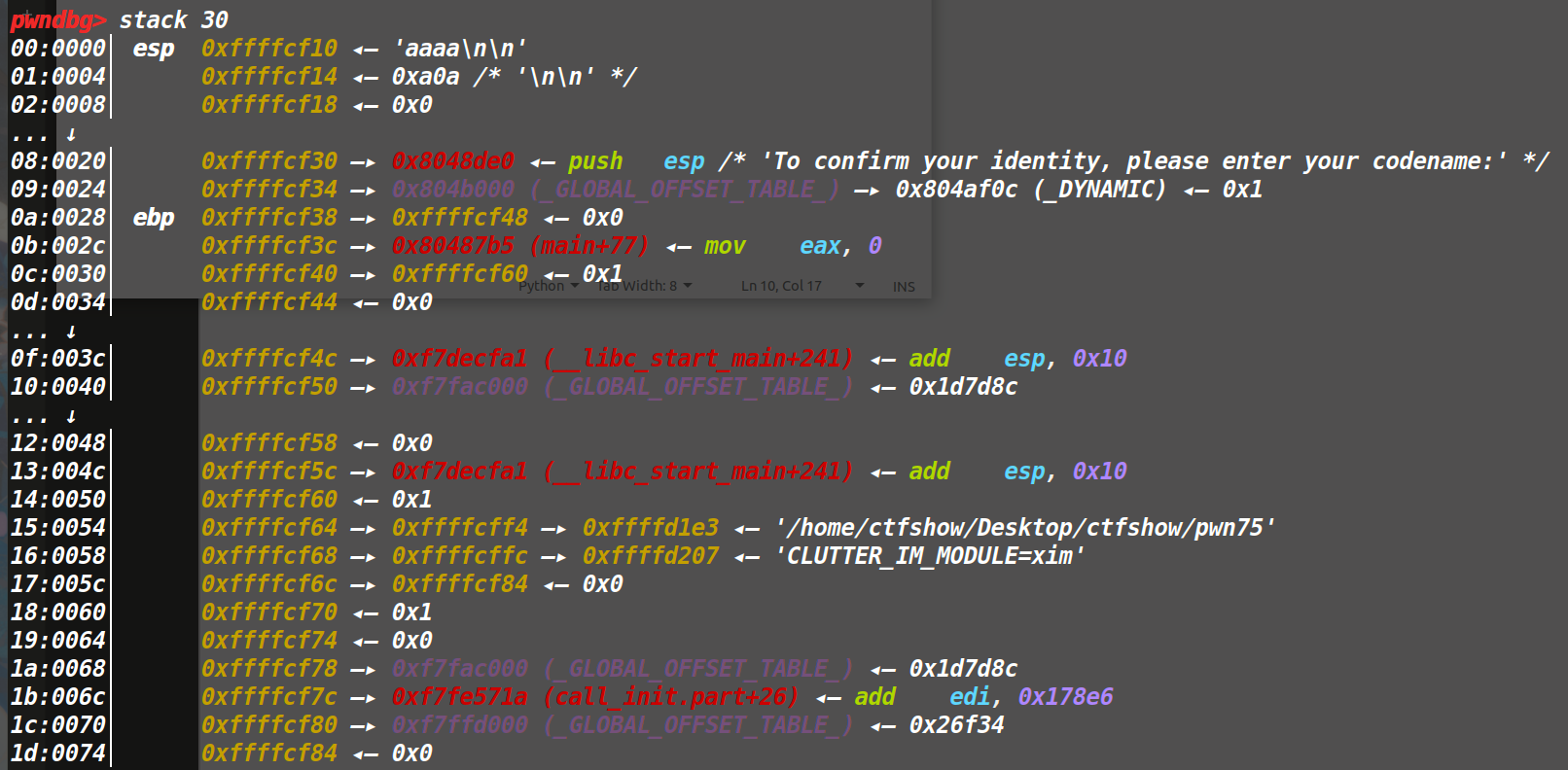 由图可知,此时 esp 位于 0xffffcf10 处,即缓冲区变量开头的’aaaa’,ebp寄存器位于 0xffffcf38,而该地址所存内容,即栈上 ebp 为 0xffffcf48,为上层main函数的old ebp。old ebp 与 缓冲区变量 相距 0x38,这说明只要使用 printf 泄露出攻击时栈上ebp所存地址,将该地址减去0x38即为 s 的准确地址,即栈迁移最终要劫持到的地方。