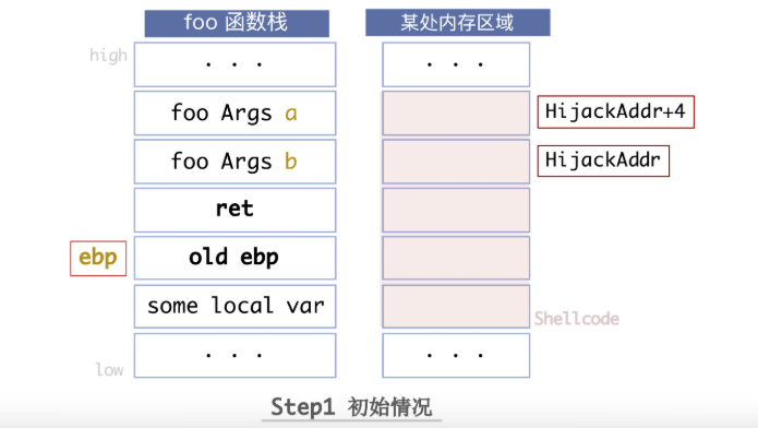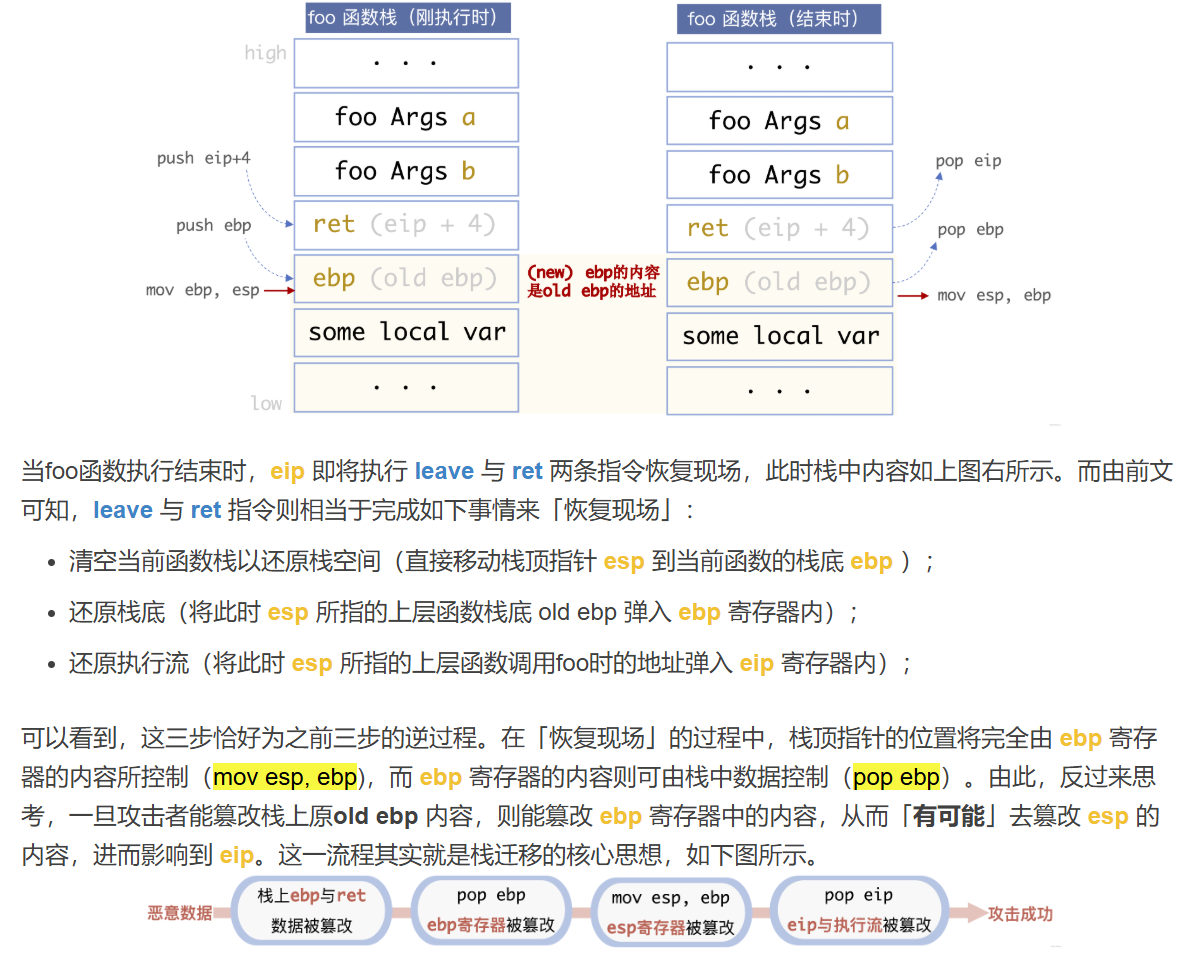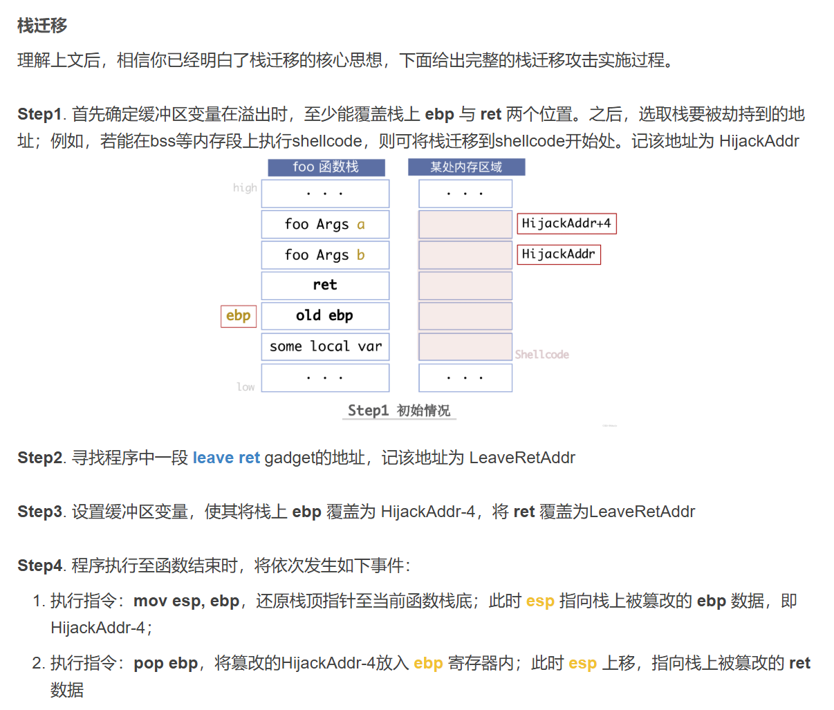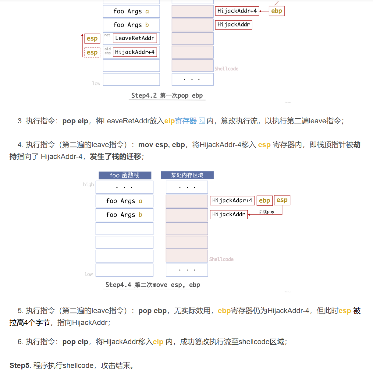 4,执行指令(第二遍的leave指令):mov esp, ebp,将HijackAddr-4移入 esp 寄存器内,即栈顶指针被劫持指向了 HijackAddr-4,发生了栈的迁移;(再一次指向ebp,发现被变了,栈也就迁移过去了)