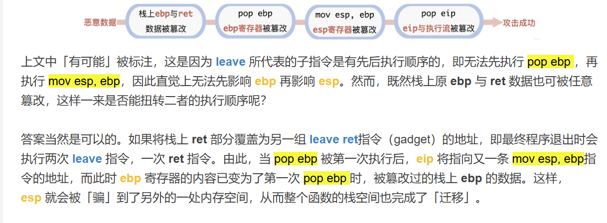 直接返回到leave函数地址,从而我们可以执行两次leave,一次ret