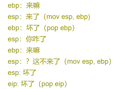 1,执行指令:mov esp, ebp,还原栈顶指针至当前函数栈底;此时 esp 指向栈上被篡改的 ebp 数据,即 HijackAddr-4;(让esp指向ebp先)