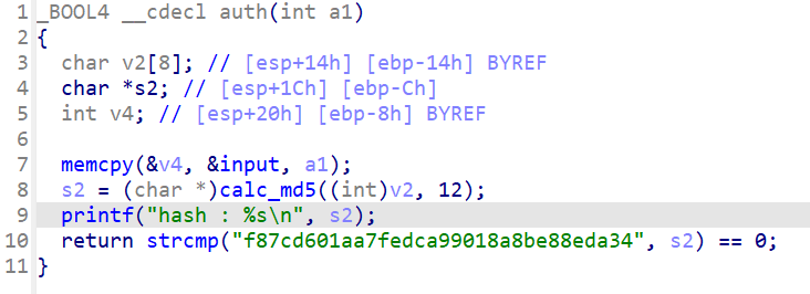 程序调用auth函数对复制到input中的数据进行验证。如果 auth函数返回1,则调用我们的后门函数,这很可能意味着成功获取了flag
