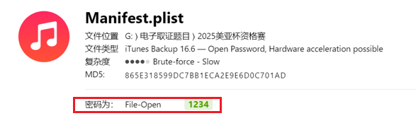 在此目录下找到Manifest.plist文件后扔到passwarekit进行爆破就好了