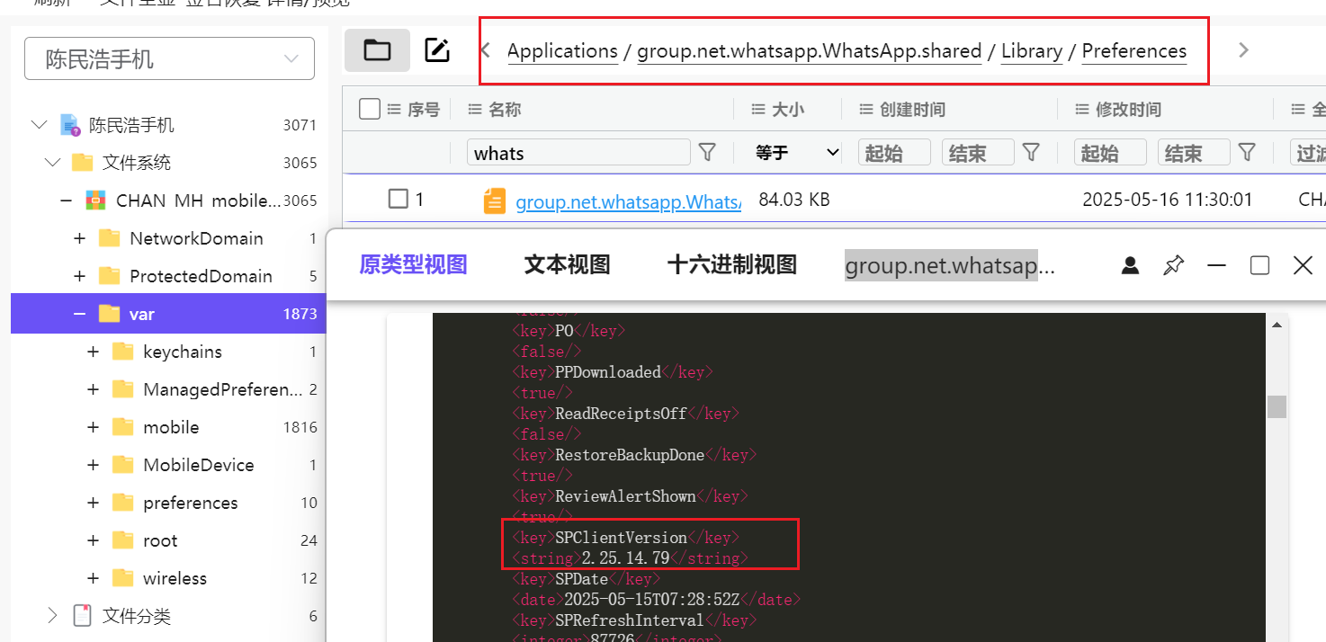 真正的版本号应该去这个软件的配置文件找,去var\mobile\Applications\group.net.whatsapp.WhatsApp.shared\Library\Preferences\