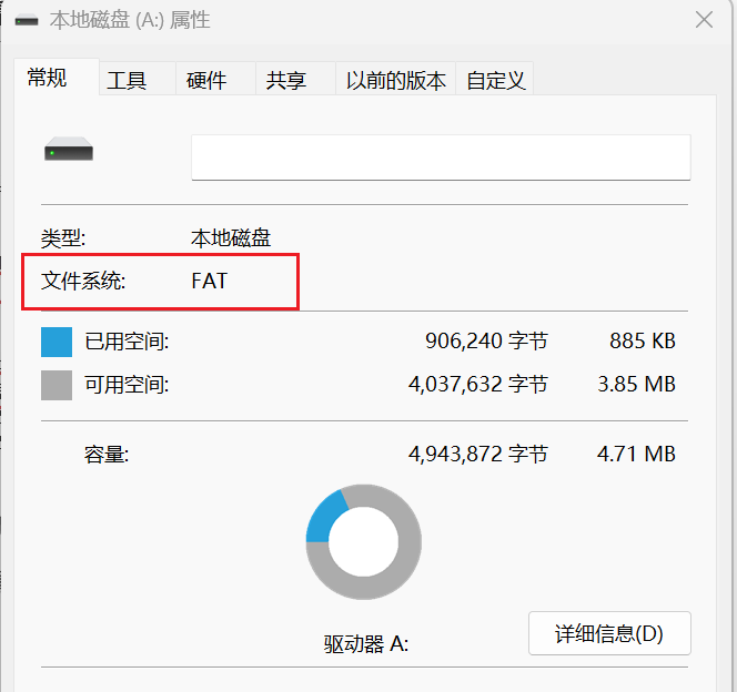 直接右键看看磁盘属性,可以看到文件系统确实是FAT