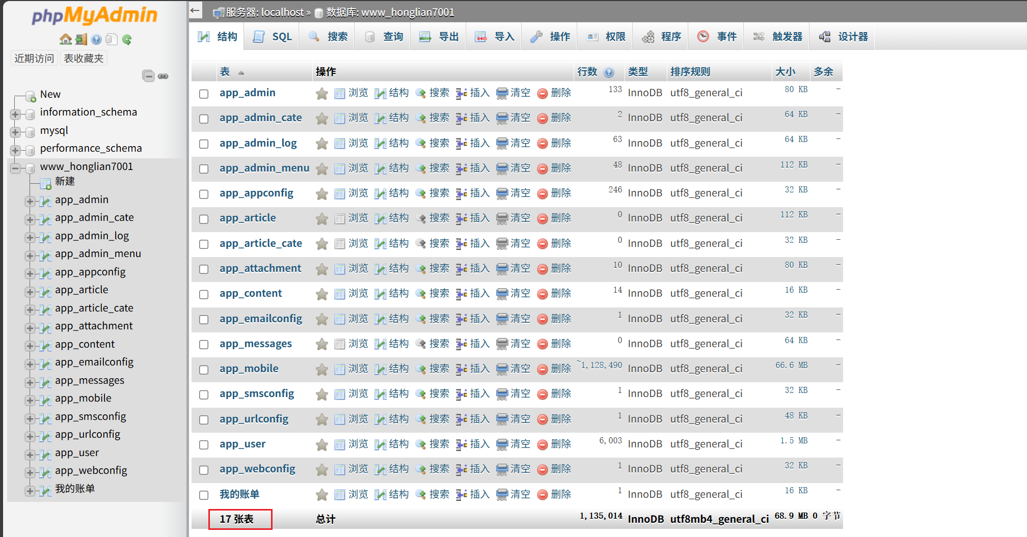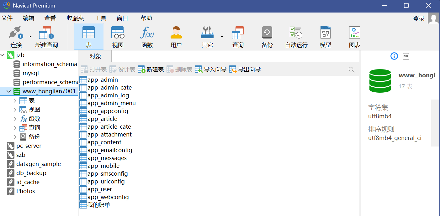 打开来看这个数据库也可以发现名下有17张表