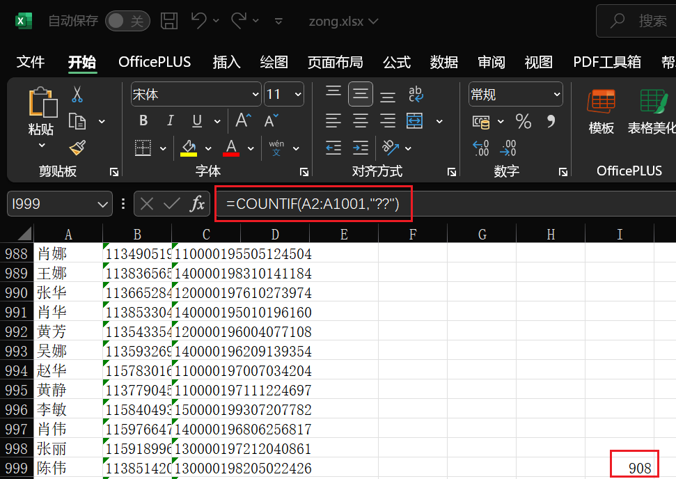 9.分析数据文件夹中的表格文件共有有多少个两个字的姓名人数。(标准格式:10)(4分)