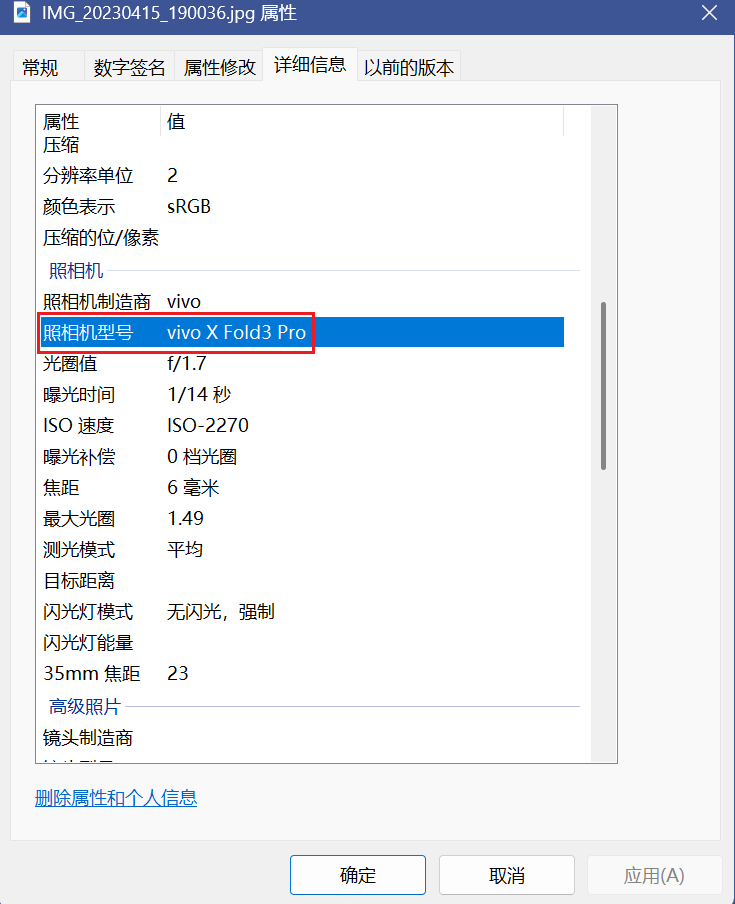 在属性中发现了照相机型号,确定就是手机型号,答案为vivo X Fold3 Pro