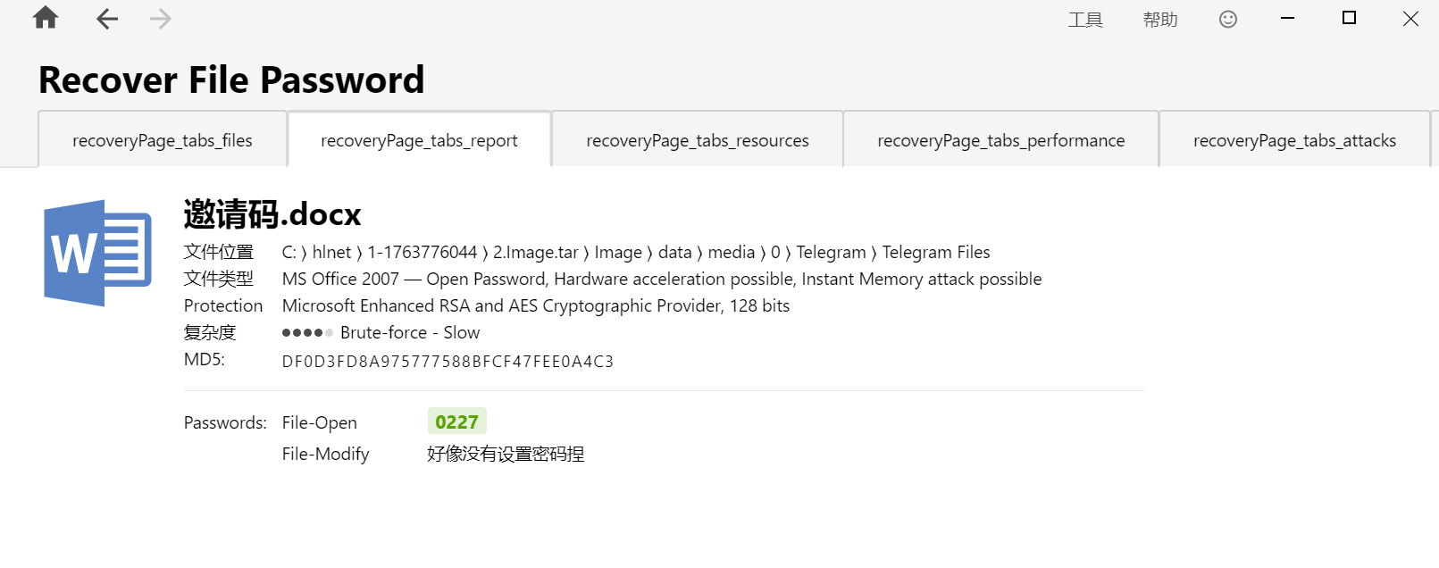 25、分析手机检材,分析机主历史使用过telegram应用中,曾保存文件记录的后台密码为?(答案格式:与线索保持一致)