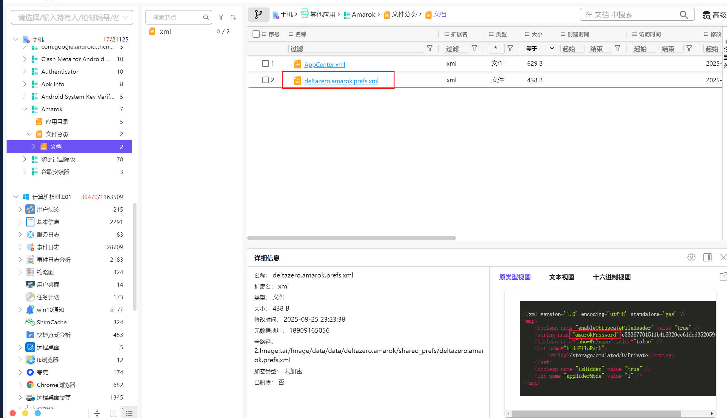 在火眼该软件的分析目录下边发现了xml文件中写了password:c33367701511b4f6020ec61ded352059