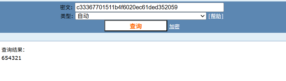 (比赛的时候hashcat一分钟多一点就爆破出来了,我省点事用在线工具写一下),最后得到是654321