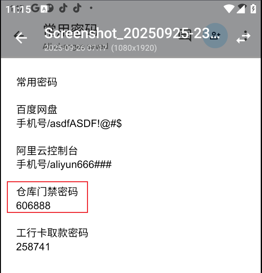 31、接上题,找到机主记录的仓库门禁密码是?(答案格式:按照实际值填写)