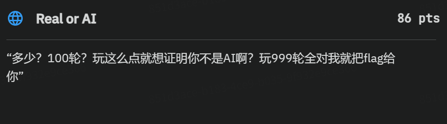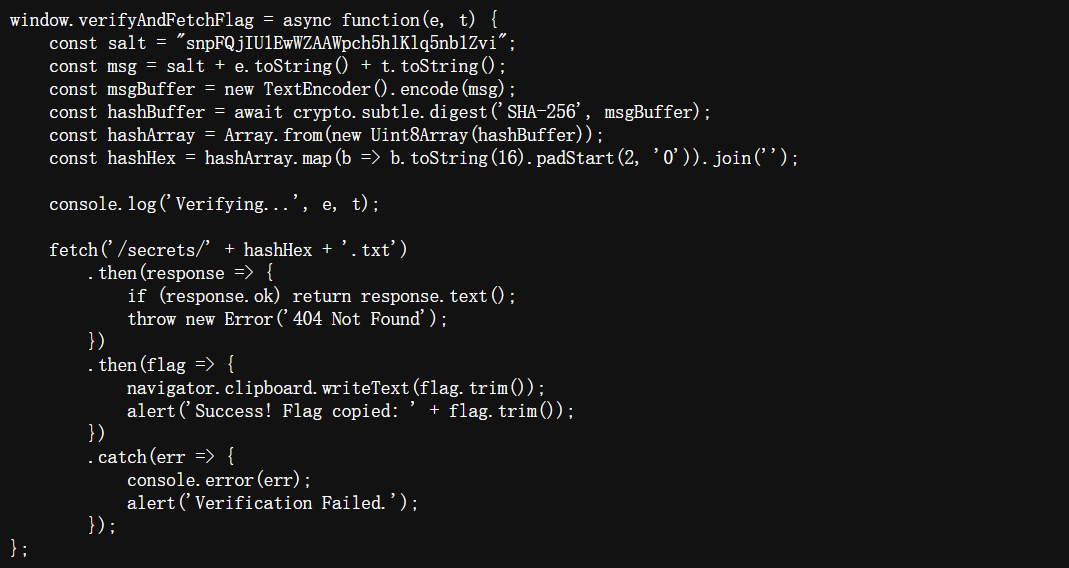 1 2 3 4 5 6 7 8 9 10 11 12 13 14 15 16 17 18 19 20 21 22 23 24 25 26 27 28 29 30 31 32 async function tryCommonCombinations() { const salt = "snpFQjIU1EwWZAAWpch5hlKlq5nb1Zvi"; // 常见总轮数 const commonTotals = [999] // 尝试满分组合 for (let t of commonTotals) { const e = t; // 满分 const msg = salt + e.toString() + t.toString(); const hashHex = sha256(msg); console.log(`尝试 e=${e}, t=${t}, 哈希: ${hashHex.substring(0, 16)}...`); try { const response = await fetch(`/secrets/${hashHex}.txt`); if (response.ok) { const flag = await response.text(); console.log(`成功! e=${e}, t=${t}, flag: ${flag}`); navigator.clipboard.writeText(flag.trim()); alert('Flag: ' + flag.trim()); return; } } catch (err) { // 继续尝试 } // 等待一下,避免请求过快 await new Promise(resolve => setTimeout(resolve, 100)); } console.log('未找到 flag'); } // 运行尝试 tryCommonCombinations();