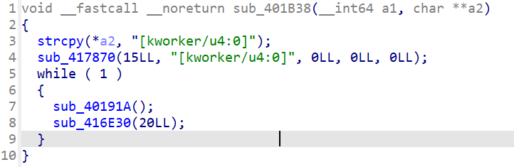 可以看到程序从这边开始,这边也是和我们刚刚的内容吻合,程序伪装成了Linux内核工作线程 [kworker/u4:0]之后每20秒进行了一次后门sub_40191A函数