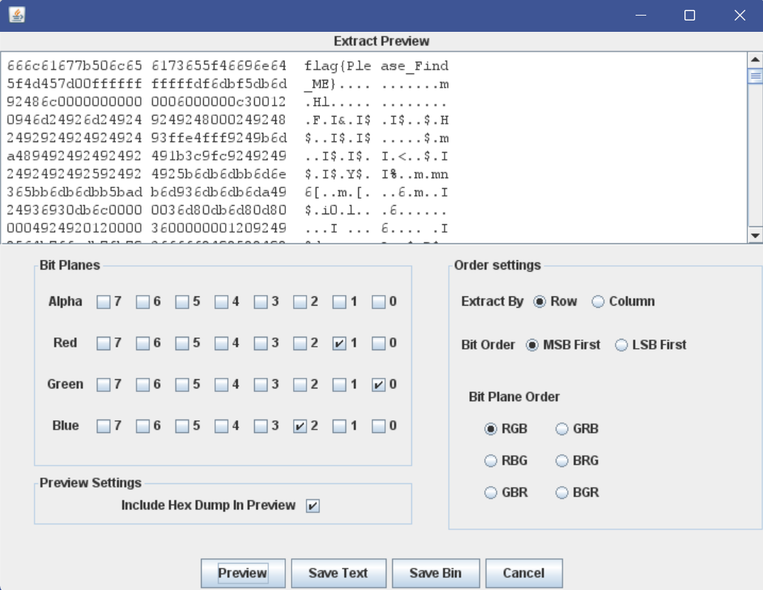 好这一题根据题目所述,就是红色通道的第一位,绿色通道的第0位和蓝色通道的第2位藏着内容,我们尝试提取这些内容