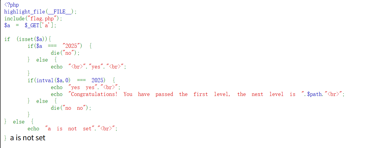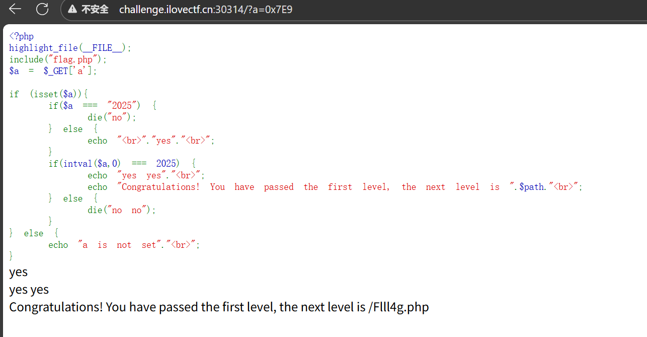 很简单的php题,只是要严格不等于2025,但是intval($a, 0)之后为2025,那直接十六进制即可