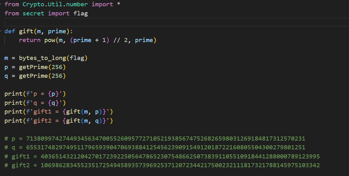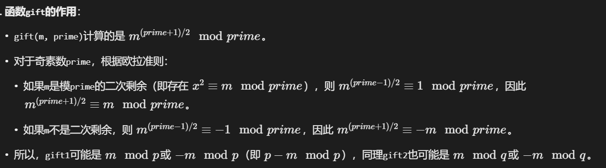 1 2 3 4 5 6 7 8 9 10 11 12 13 14 15 16 17 18 19 20 21 22 23 24 25 26 27 28 29 30 31 32 33 34 35 36 37 38 39 40 41 42 43 from Crypto.Util.number import long_to_bytes # 给定值 p = 71380997427449345634700552609577271052193856747526826598031269184817312570231 q = 65531748297495117965939047069388412545623909154912018722160805504300279801251 gift1 = 40365143212042701723922505647865230754866250738391105510918441288000789123995 gift2 = 10698628345523517254945893573969253712072344217500232111817321788145975103342 # 计算 n = p * q n = p * q # 定义CRT函数(针对两个模数) def crt(a, p, b, q): """解方程组: x ≡ a mod p 且 x ≡ b mod q""" # 计算p在模q下的逆元 inv_p = pow(p, -1, q) k = (b - a) * inv_p % q x = a + p * k return x % (p * q) # 枚举四种情况 candidates = [] # 情况1: m ≡ gift1 mod p, m ≡ gift2 mod q candidates.append(crt(gift1, p, gift2, q)) # 情况2: m ≡ gift1 mod p, m ≡ (q - gift2) mod q candidates.append(crt(gift1, p, q - gift2, q)) # 情况3: m ≡ (p - gift1) mod p, m ≡ gift2 mod q candidates.append(crt(p - gift1, p, gift2, q)) # 情况4: m ≡ (p - gift1) mod p, m ≡ (q - gift2) mod q candidates.append(crt(p - gift1, p, q - gift2, q)) # 检查每个候选m for i, m_candidate in enumerate(candidates): try: flag_candidate = long_to_bytes(m_candidate) # 检查是否包含常见flag格式(如可读ASCII) if flag_candidate.startswith(b'flag{') or all(32 <= byte < 127 for byte in flag_candidate): print(f"情况 {i+1} 成功: {flag_candidate}") break except: continue else: print("未找到有效flag,请检查枚举情况。")