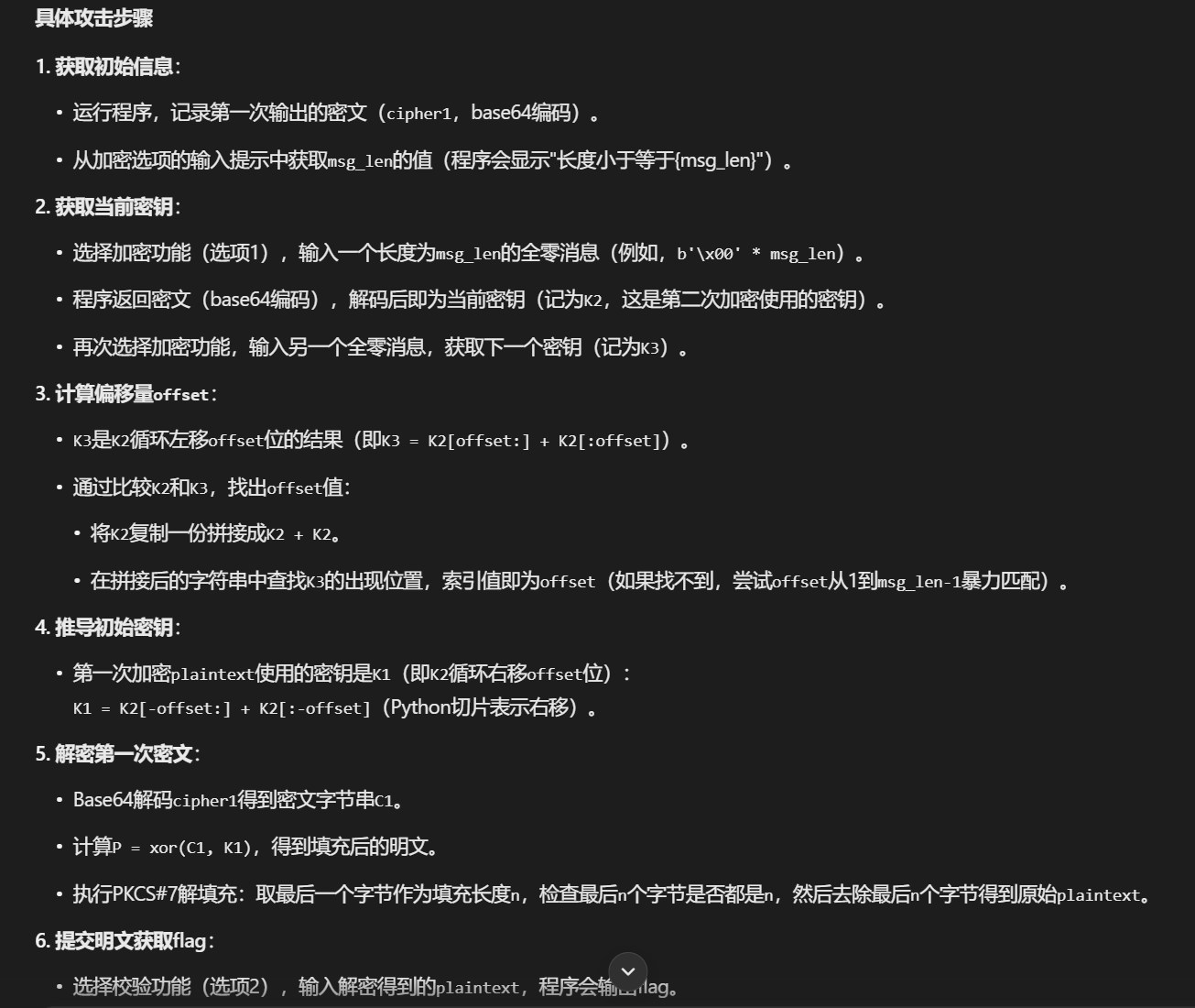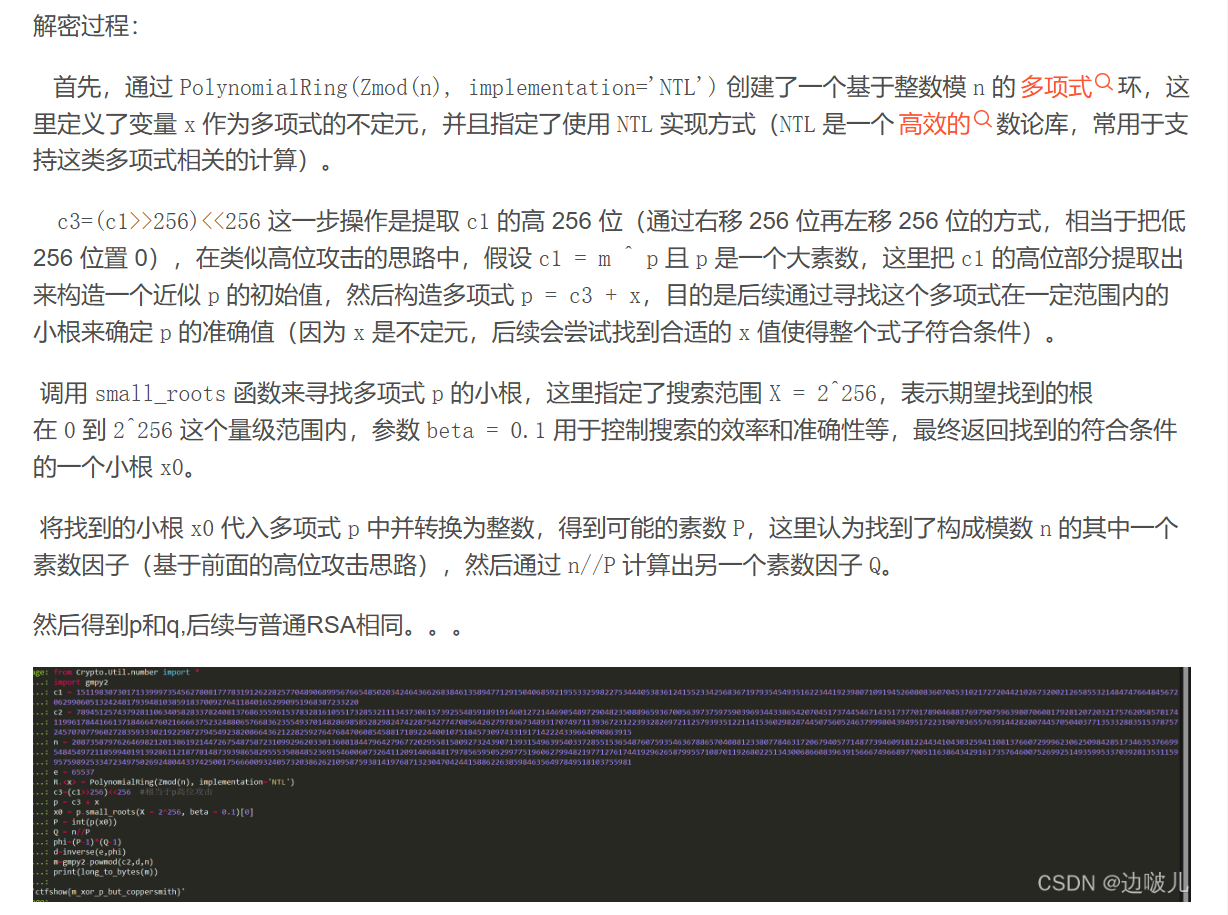 1 2 3 4 5 6 7 8 9 10 11 12 13 14 15 16 17 18 19 20 21 22 23 24 25 26 27 28 29 30 31 32 33 34 35 36 37 38 39 40 41 42 43 44 45 46 47 48 49 50 51 52 53 54 55 56 57 58 59 60 61 62 63 64 65 66 67 68 69 70 71 from Crypto.Util.number import long_to_bytes import math # 给定数据 n = 118951231851047571559217335117170383889369241506334435506974203511684612137655707364175506626353185266191175920454931743776877868558249224244622243762576178613428854425451444084313631798543697941971483572795632393388563520060136915983419489153783614798844426447471675798105689571205618922034550157013396634443 e1 = 2819786085 e2 = 4203935931 c1 = 104852820628577684483432698430994392212341947538062367608937715761740532036933756841425619664673877530891898779701009843985308556306656168566466318961463247186202599188026358282735716902987474154862267239716349298652942506512193240265260314062483869461033708176350145497191865168924825426478400584516421567974 c2 = 43118977673121220602933248973628727040318421596869003196014836853751584691920445952955467668612608693138227541764934104815818143729167823177291260165694321278079072309885687887255739841571920269405948846600660240154954071184064262133096801059918060973055211029726526524241753473771587909852399763354060832968 # 计算 e1 和 e2 的 GCD d = math.gcd(e1, e2) print(f"GCD of e1 and e2: {d}") # 扩展欧几里得算法,找到 s1 和 s2 使得 e1*s1 + e2*s2 = d def extended_gcd(a, b): if b == 0: return (1, 0, a) else: x, y, g = extended_gcd(b, a % b) return (y, x - (a // b) * y, g) s1, s2, _ = extended_gcd(e1, e2) print(f"s1 = {s1}, s2 = {s2}") # 处理负指数:如果 s1 或 s2 为负,计算对应密文的模逆元 if s1 < 0: c1_inv = pow(c1, -1, n) c1_val = pow(c1_inv, -s1, n) else: c1_val = pow(c1, s1, n) if s2 < 0: c2_inv = pow(c2, -1, n) c2_val = pow(c2_inv, -s2, n) else: c2_val = pow(c2, s2, n) # 计算 T = c1^s1 * c2^s2 mod n = m^d mod n T = (c1_val * c2_val) % n # 尝试计算 T 的立方根(因为 d=3) def integer_cube_root(x): # 使用二分查找计算整数立方根 if x < 0: return -integer_cube_root(-x) low, high = 0, x while low <= high: mid = (low + high) // 2 mid3 = mid ** 3 if mid3 < x: low = mid + 1 elif mid3 > x: high = mid - 1 else: return mid # 找到精确立方根 return None # 不是精确立方根 m_candidate = integer_cube_root(T) if m_candidate is not None: # 验证解密结果是否为文本 flag = long_to_bytes(m_candidate) try: print(flag.decode()) except UnicodeDecodeError: print("Found integer but not valid text. Trying alternative methods...") # 如果直接立方根失败,可能 m^3 >= n,需要解模方程 x^3 ≡ T mod n # 但由于 n 是合数且大,分解困难,这里尝试小根攻击或其它方法可能不适用 # 建议检查 m 是否较小,或使用更高级的工具(如 gmpy2) else: print("T is not a perfect cube.可能需要更复杂的攻击(如分解 n 或使用 Coppersmith 方法)。")