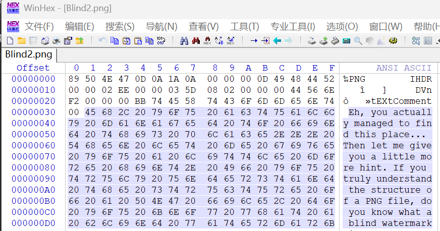 查看十六进制发现了这样子一句话:你知道盲水印是什么吗?