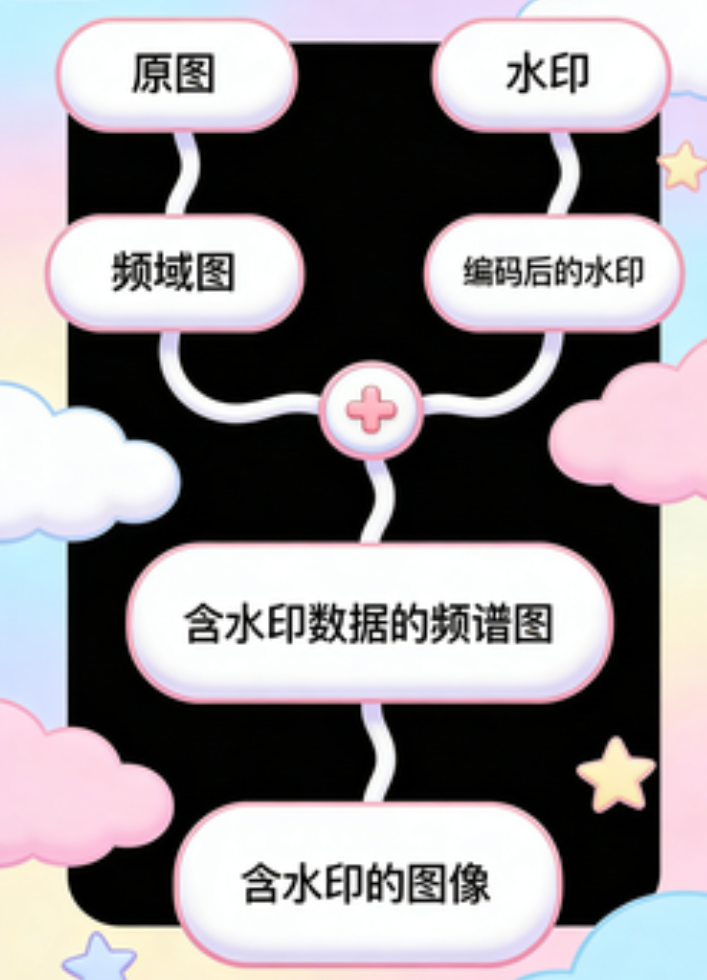 大概就是图片变成频谱图,然后水印变成编码后的水印,俩合成一张含水印数据的频谱图