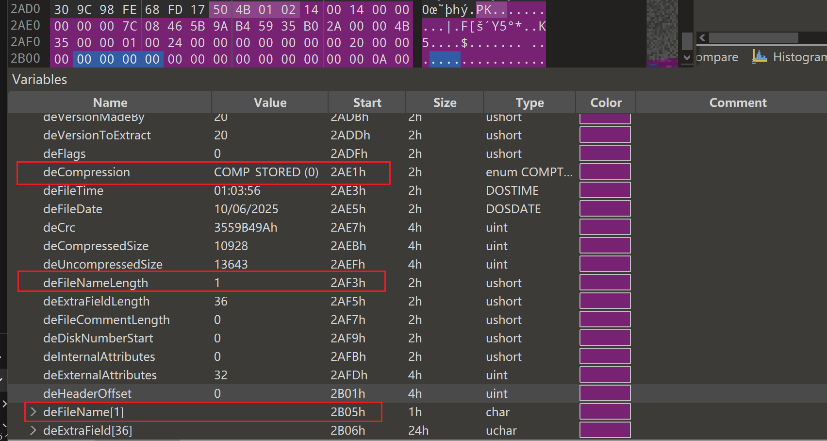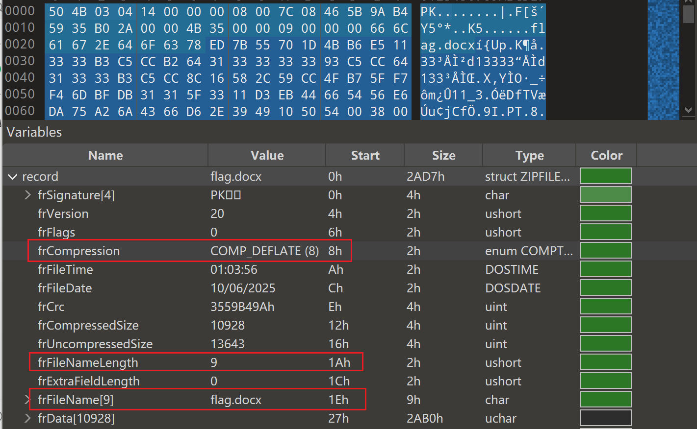 对照可以发现是deCompression、deFileNameLength和deFileName三部分遭到了修改,我们照着record区的数据改回来