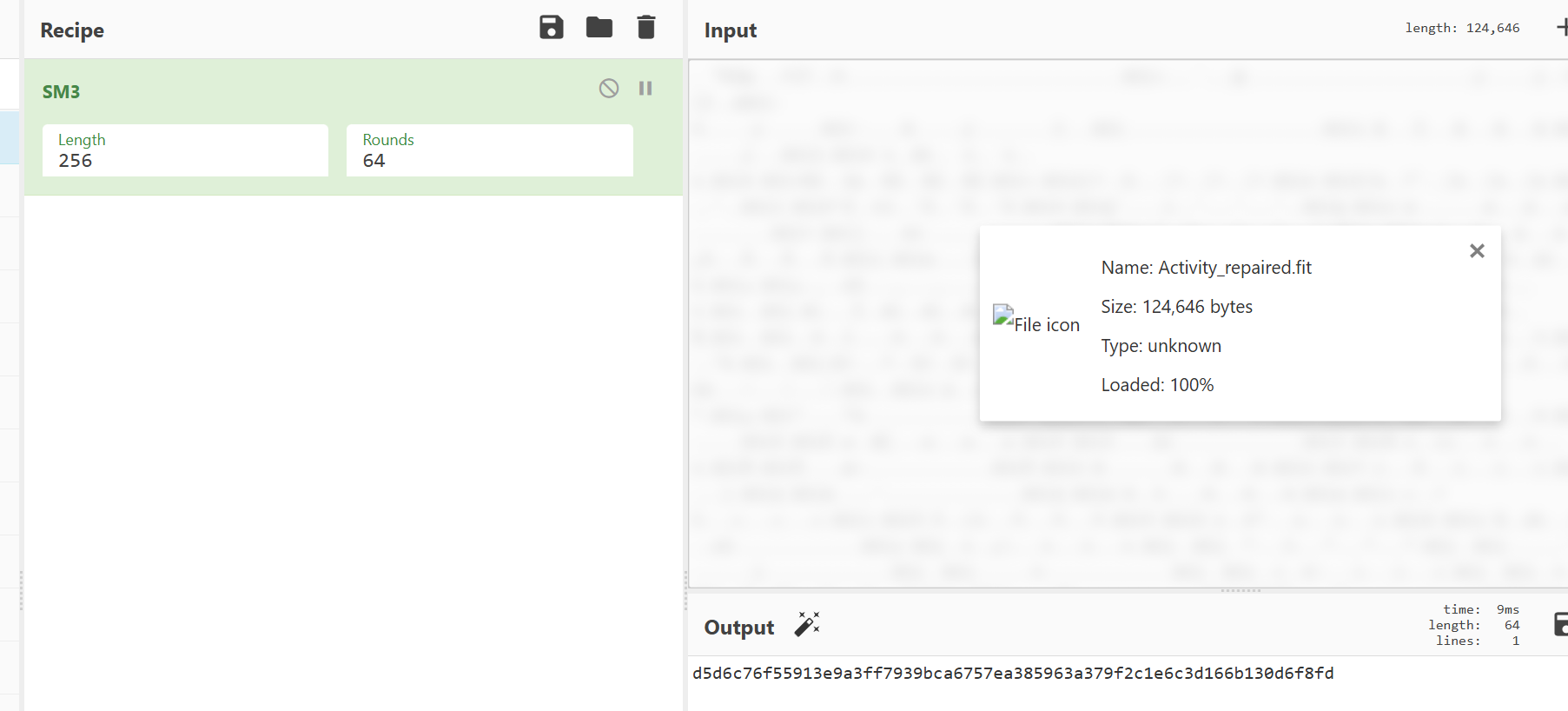 用户桌面上存在一个从运动设备中导出的运动记录文件,该文件存在损坏,请尝试修复并给出修复后的SM3校验值 (全大写)