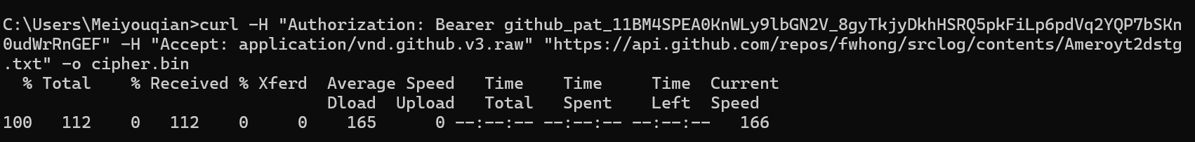 curl -H “Authorization: Bearer github_pat_11BM4SPEA0KnWLy9lbGN2V_8gyTkjyDkhHSRQ5pkFiLp6pdVq2YQP7bSKn0udWrRnGEF” -H “Accept: application/vnd.github.v3.raw” “https://api.github.com/repos/fwhong/srclog/contents/Ameroyt2dstg.txt“ -o cipher.bin