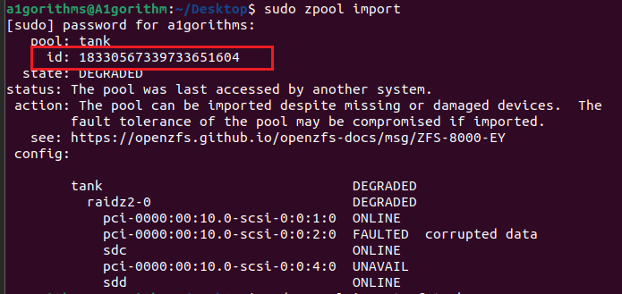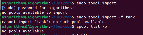 我们使用 sudo zpool import -f tank 即可忽略错误, 强制挂载 zfs 存储池