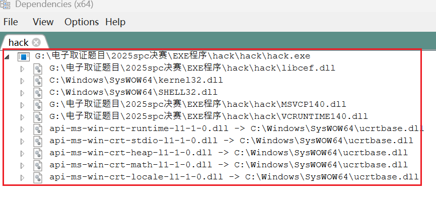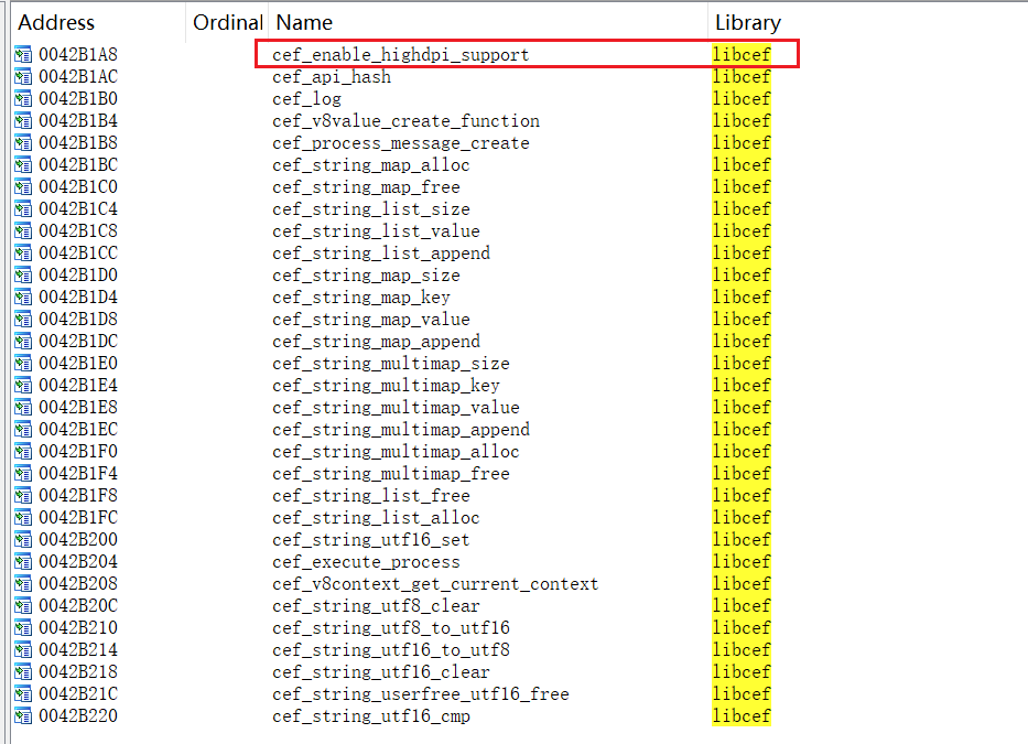 发现这个dll的确导出了cef_enable_highdpi_support这个函数,但是同时也导出了很多奇奇怪怪的随机字符串,这说明了这个dll不是正常的CEF的libcef.dll,因为不是那般规整