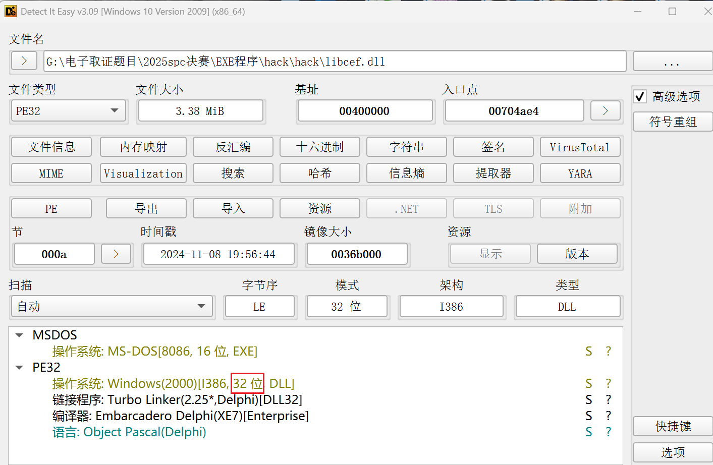 在die打开上一题的dll文件,发现是32位的