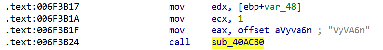 真正的调用应该是sub_40ACB0(“VyVA6n”,v16[1],1)这才对啊