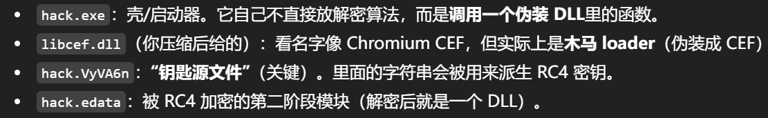 我们明白,解密的入口并不在hack.exe,而是在第三题确定的libcef.dll中
