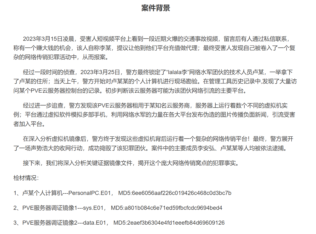 1.请分析卢某的计算机,并计算原始检材的SHA256值。