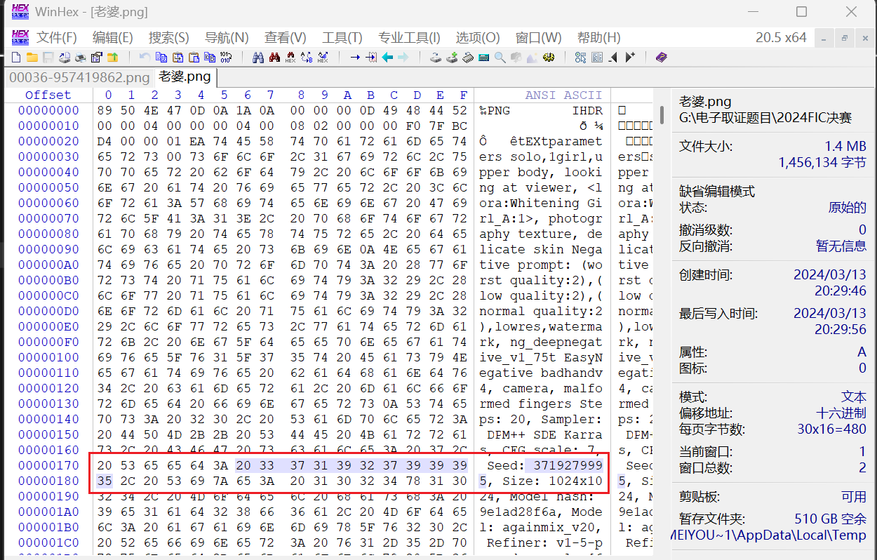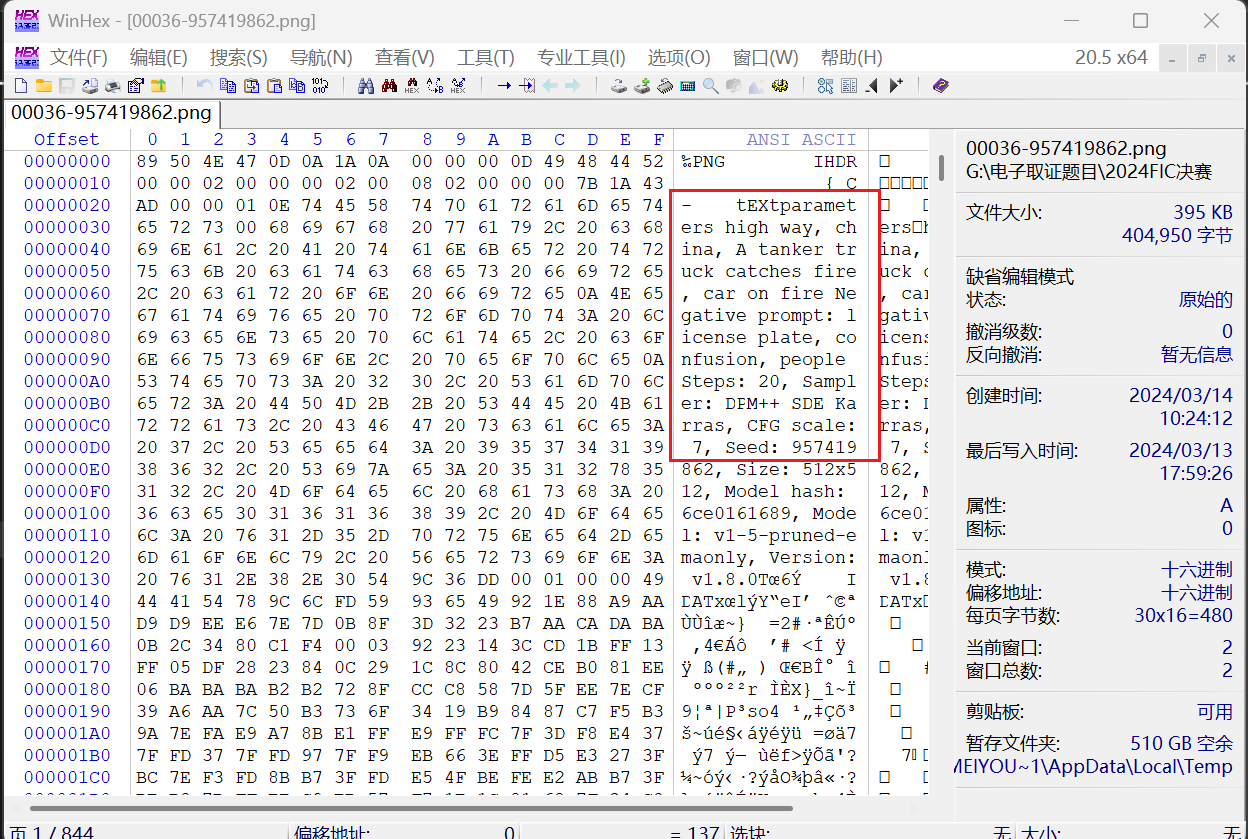 提示词会放在png的IHDR块中,查看即可