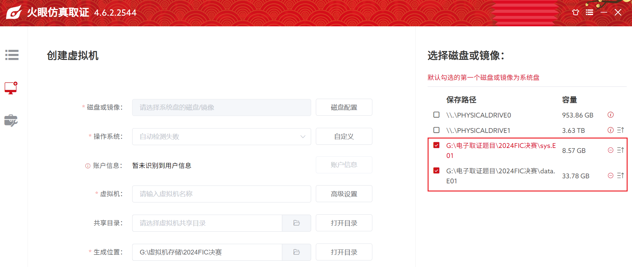 尤其要注意顺序,先放系统盘再放数据盘,如果反着放会把这俩搞反(然后就显示system not found打不开了,火眼还不会自动检测)